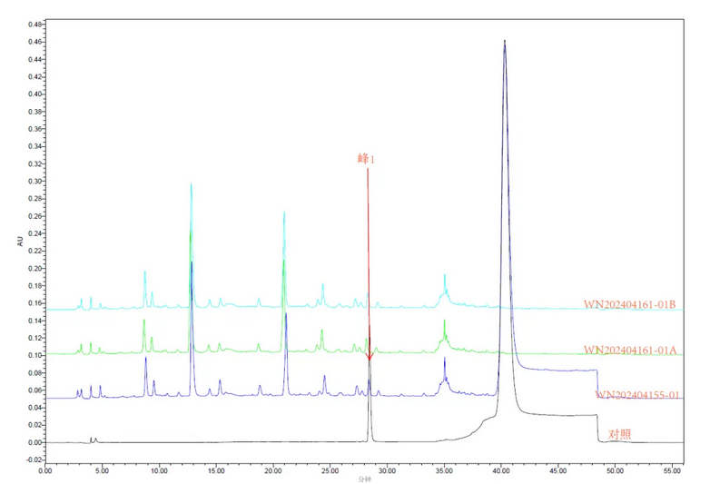 某藥企公斤級單體委托生產(chǎn)的原料及成品HPLC圖譜: